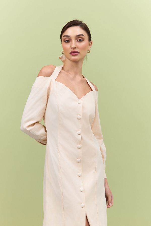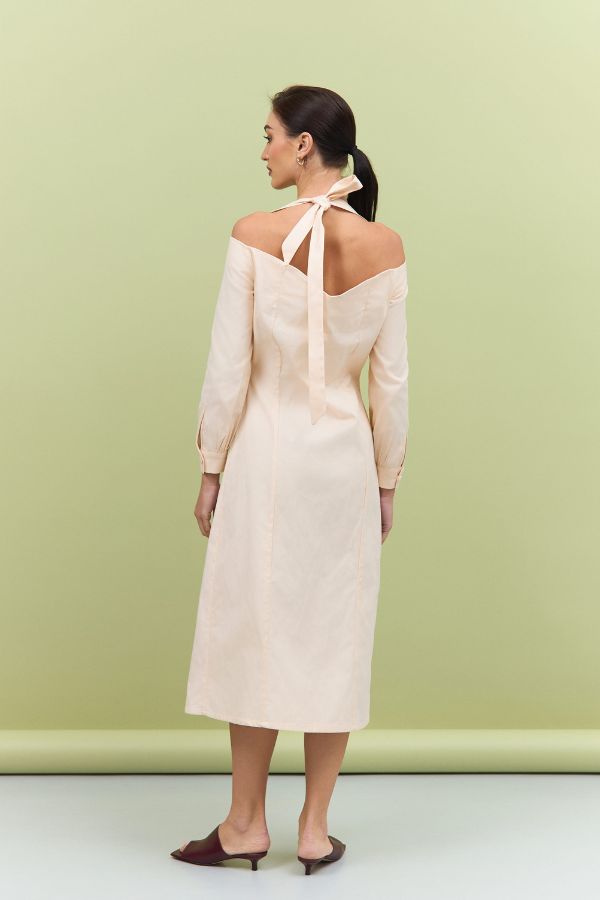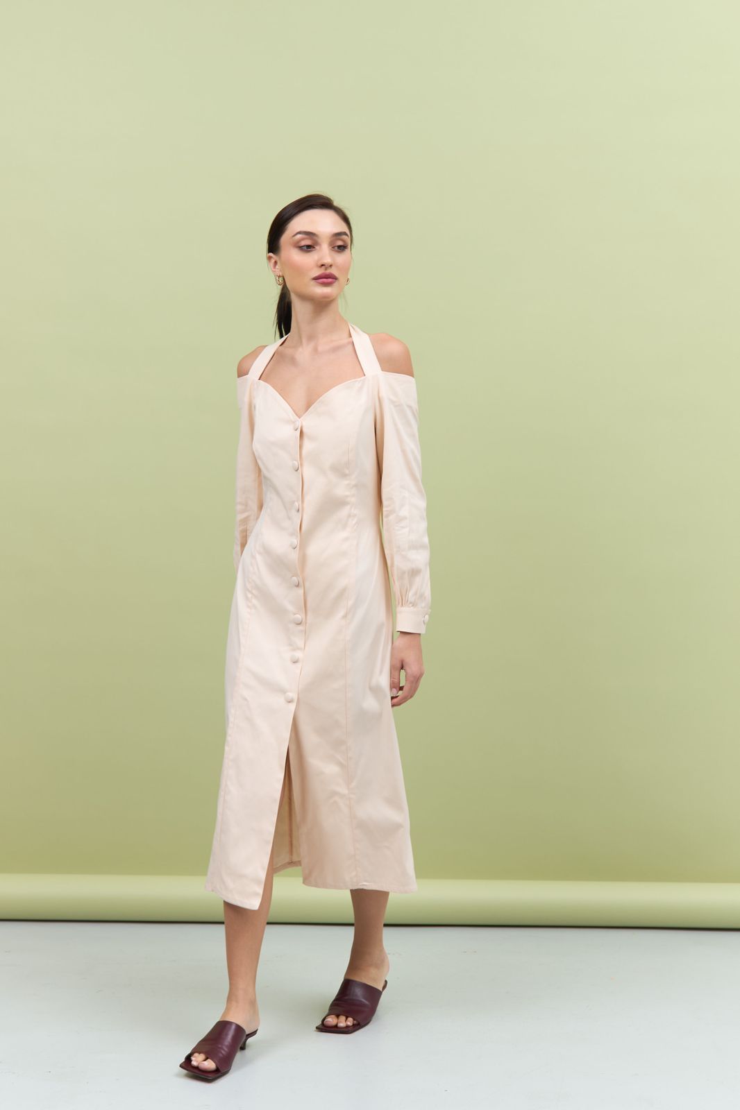 The Luna Dress is crafted from Italian luxury cotton, offering a perfect balance of sophistication and modern femininity. Its structured bodice with halter-inspired straps and off-shoulder sleeves create a romantic yet contemporary silhouette.