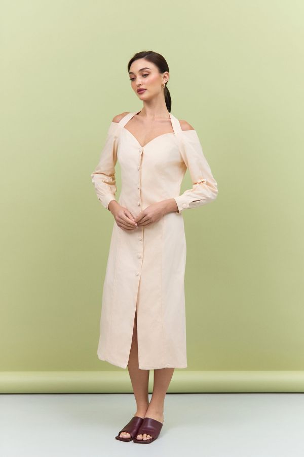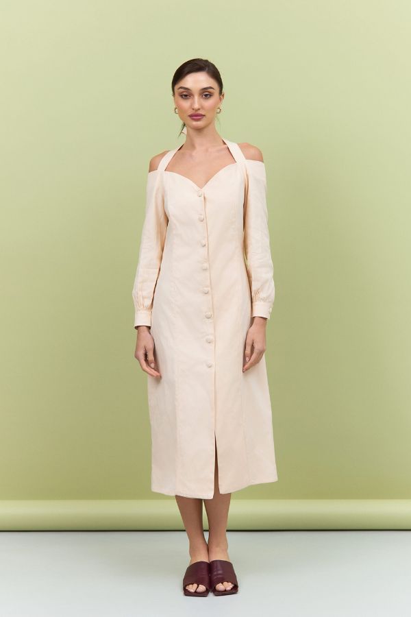Finished with a button-down front and an elegant midi length, the Luna Dress transitions seamlessly from day to evening. Lightweight, breathable, and timeless, it embodies the essence of understated luxury.