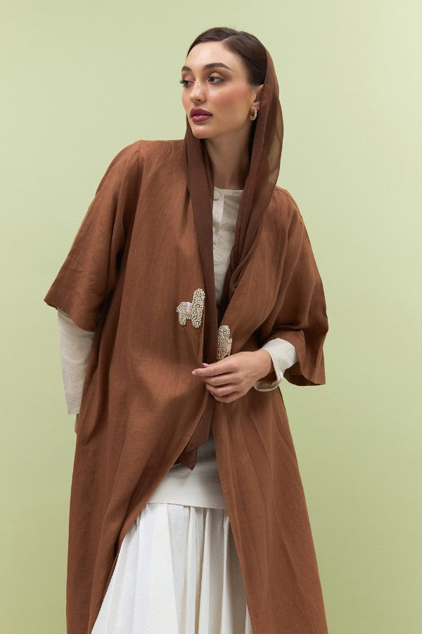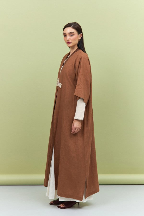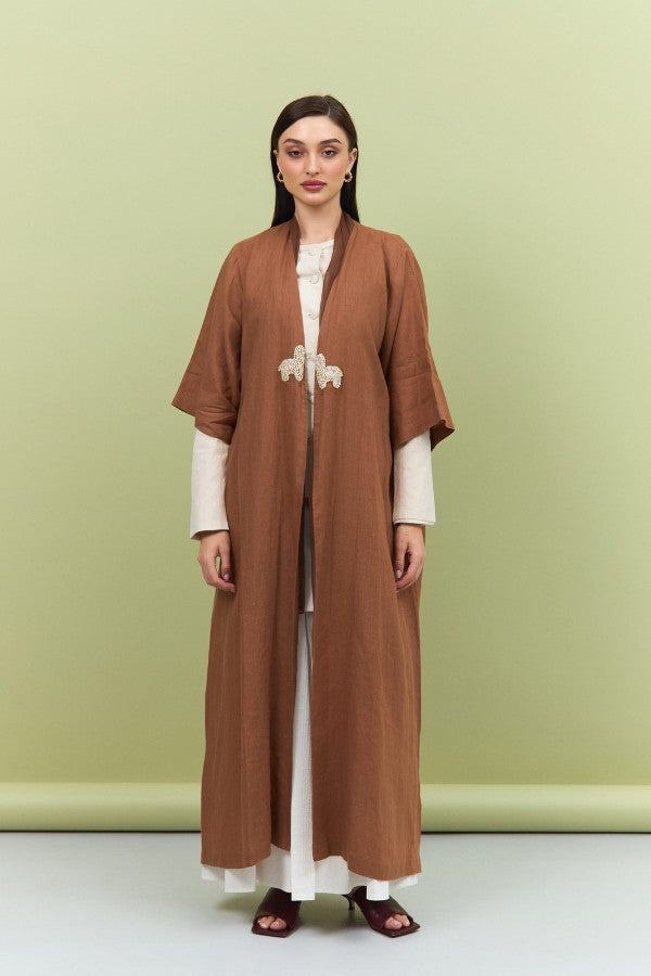 The Aurelia Abaya is crafted from 100% pure linen, blending effortless comfort with timeless elegance. Its highlight is the hand-embroidered golden llama motif, brought to life through 10 hours of meticulous craftsmanship.