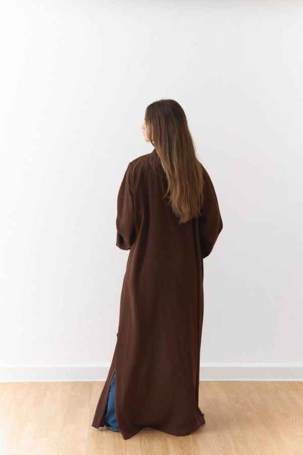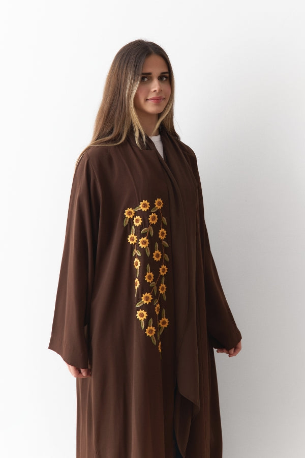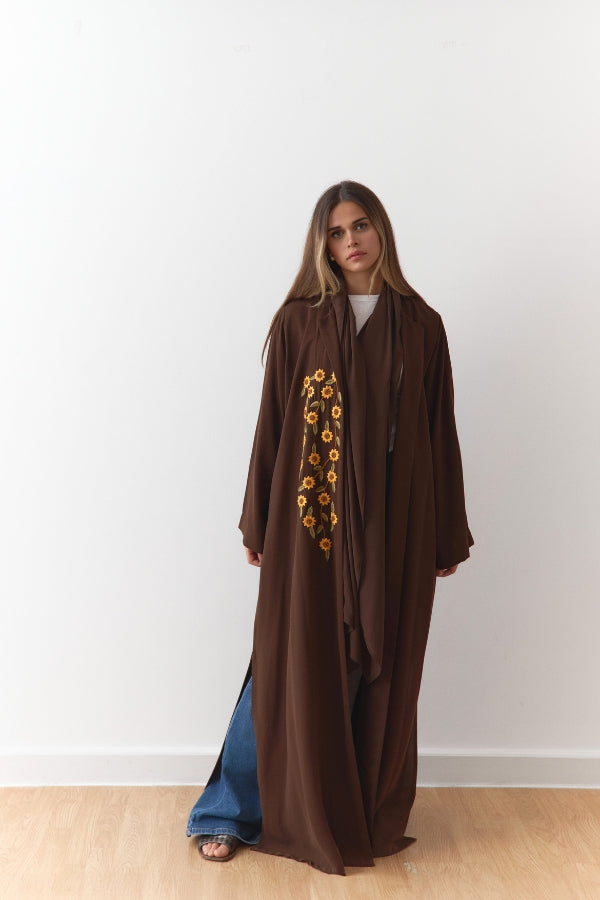 The Nour Abaya is a full-length masterpiece, crafted from premium crepe for a refined drape and elegant flow. Adorned with hand-embroidered sunflowers, each piece requires over 15 hours of meticulous craftsmanship, making it a true work of wearable art.