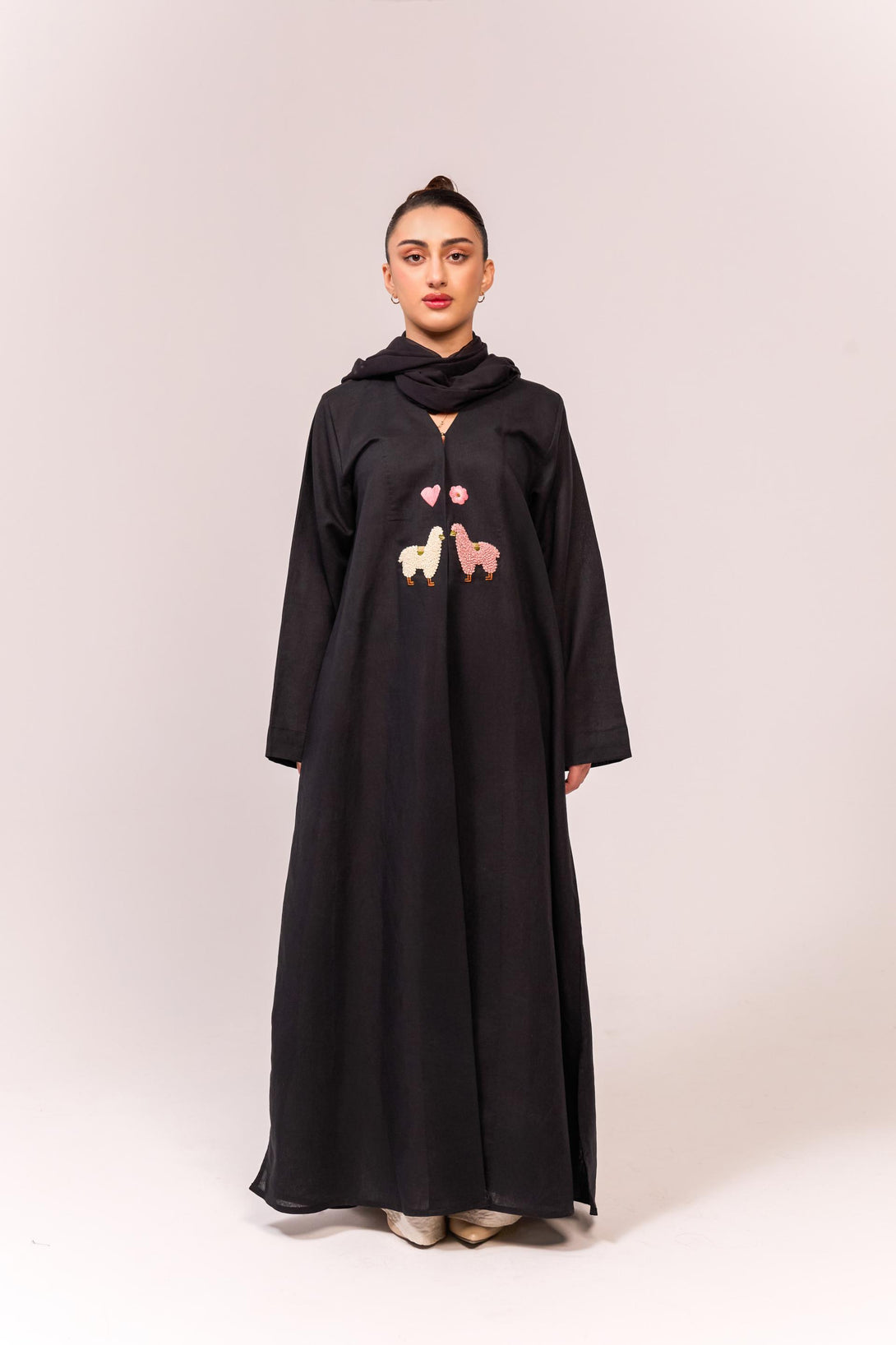 The Rola Abaya blends modern elegance with artisanal detail. Crafted from breathable linen, it features delicate hand embroidery on the front—two charming llamas paired with a heart and flower motif. Each stitch reflects hours of skilled craftsmanship, bringing texture and personality to the minimalist silhouette.
