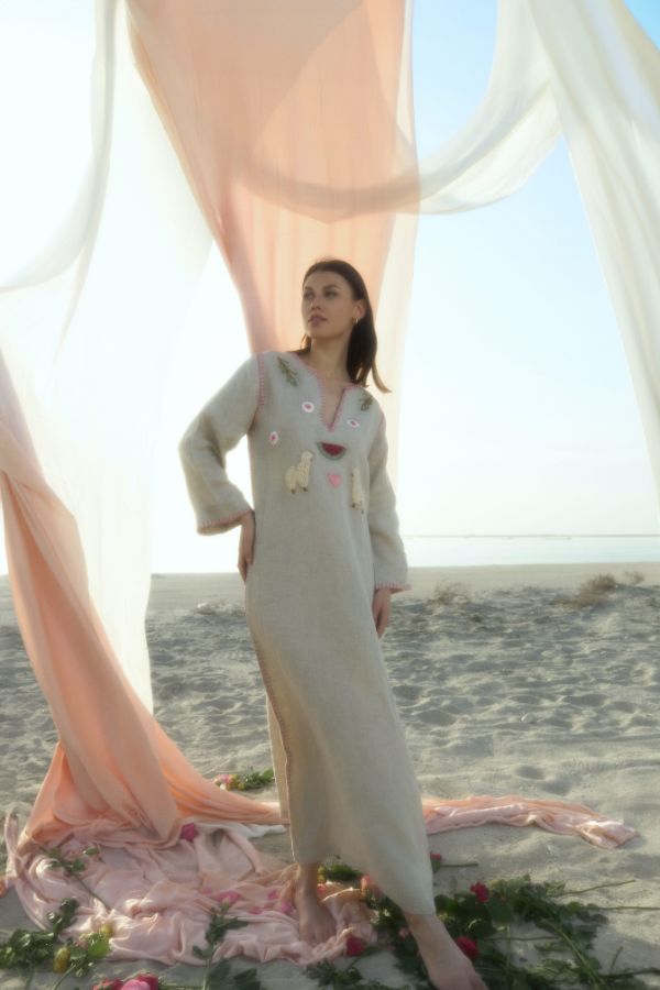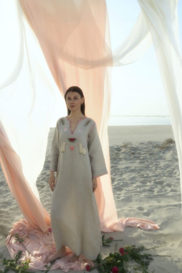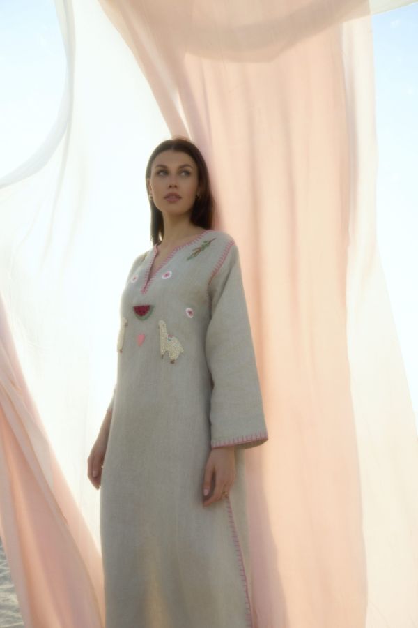 The Salam Kaftan is crafted from 100% pure linen, offering natural breathability and timeless elegance. Adorned with unique llama embroidery and a vibrant watermelon symbol of solidarity, each piece requires over 12 hours of meticulous hand embroidery to complete.