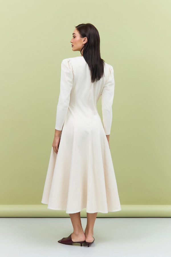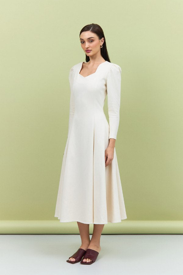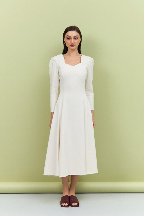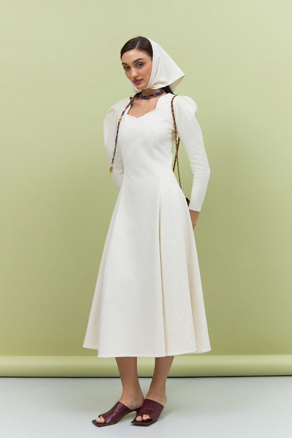 Featuring delicately puffed shoulders and a midi length, this dress transitions seamlessly from day to evening, embodying effortless sophistication. Lightweight, breathable, and refined, the Nada Dress is a wardrobe essential for women who appreciate understated luxury.